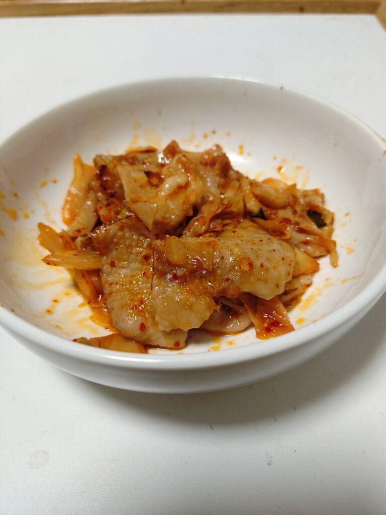 さあ、できたぞ。まずは鶏皮を一口。プルンプルンの食感とキムチの辛味、ごま油とにんにくの風味が合わさり、まさに暴力的。
