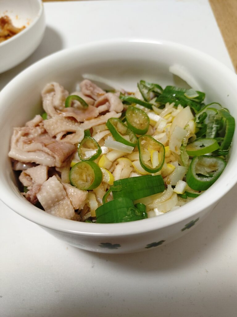 器の底に薄〜く切った玉ねぎを敷き詰め、その上に細切りにした鶏皮と輪切りにした長葱の青い部分と粗みじん切りにした白葱を乗せポン酢をかける。粗みじんではなく白髪葱でも良いが、白髪は俺の頭とひげだけでじゅうぶんだ。