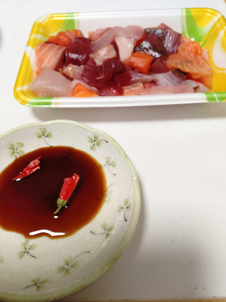 刺身の端っこ盛り。無精ひげのど定番、唐辛子醤油で。