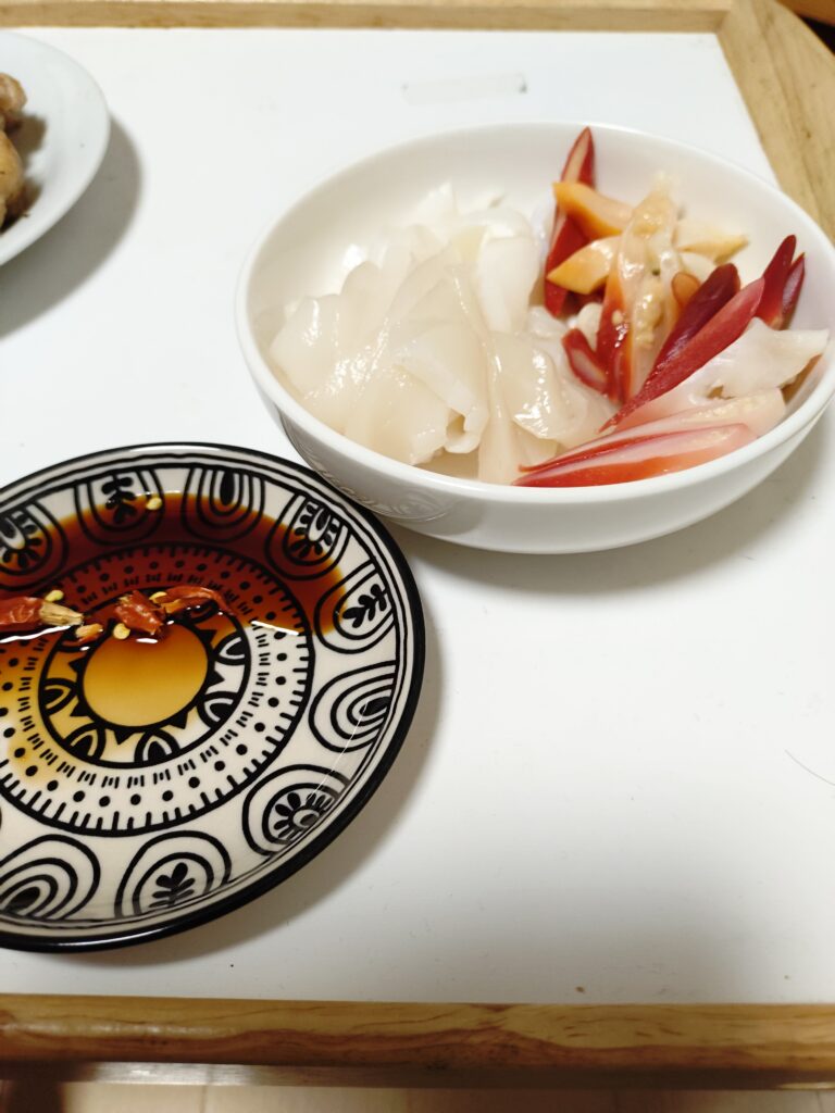 毎度お馴染みのソデイカ。今回の相方は北寄貝。そしてもはや名物化した唐辛子醤油。