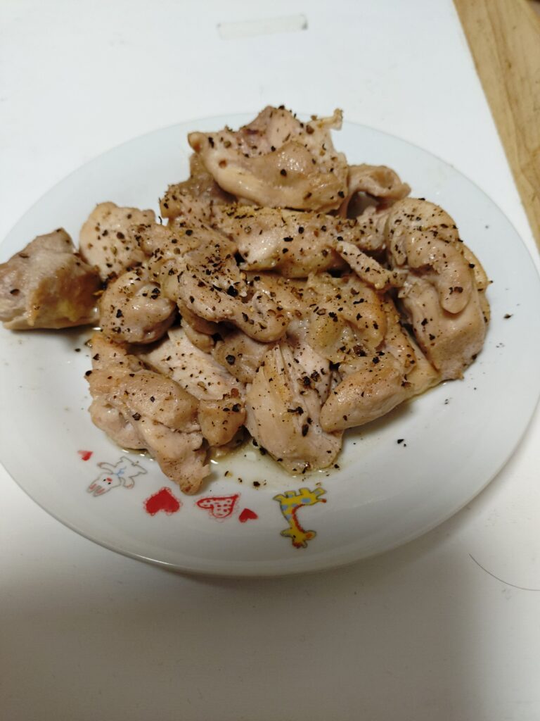塩胡椒で焼いて仕上げに黒胡椒をたっぷりと。本当はキムチを入れて鶏キムチ炒めにしたかったのだが、そこは無精ひげ。面倒くささが勝った…。