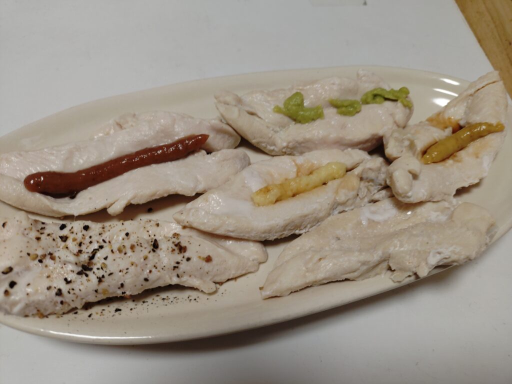 上から時計回りで、練り梅、わさび、辛子醤油、塩、黒胡椒、真ん中のは生姜醤油。全てシンプルな味付け。