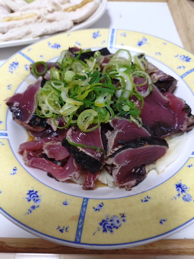 二品目は鰹のたたき。これは何のひねりもない。皿にタマネギを敷きつめ鰹を乗せ、本気豆腐で余った葱を乗せただけのもの。味付けはポン酢のみ。