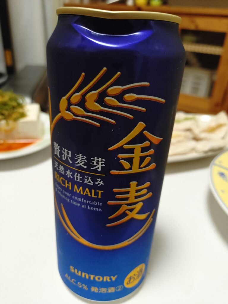 「帰れば金麦」上部が凹んでいるのは、活きの良い金麦もいたもので、冷蔵庫から取り出す際に手を滑らせて落とした時のものだ。