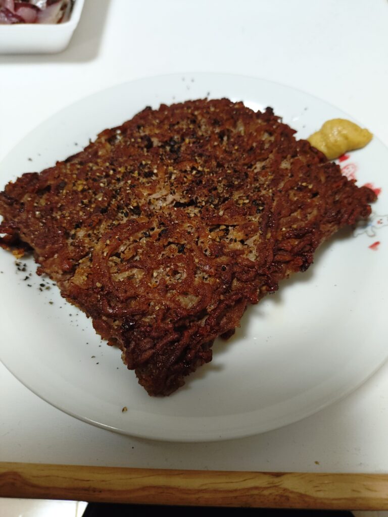 弱火でじっくり焼く事により、内部まで完全に火が通る。ただ欠点としては、じっくり焼く分、内部の肉汁が多少流れ出る。肉汁を取るかカリカリ感を取るか、いつも悩む。