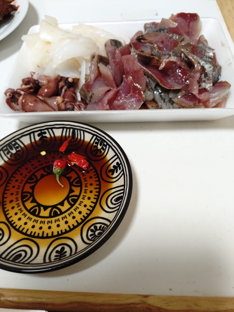 だが、その分美味い。唐辛子醤油がうるめの脂と身の甘みを引き立てて、乗りすぎている脂もさっぱりとさせてくれる。実は刺身を食す際に使用するこの唐辛子醤油も漁師時代に年寄連中から教わったものだ。