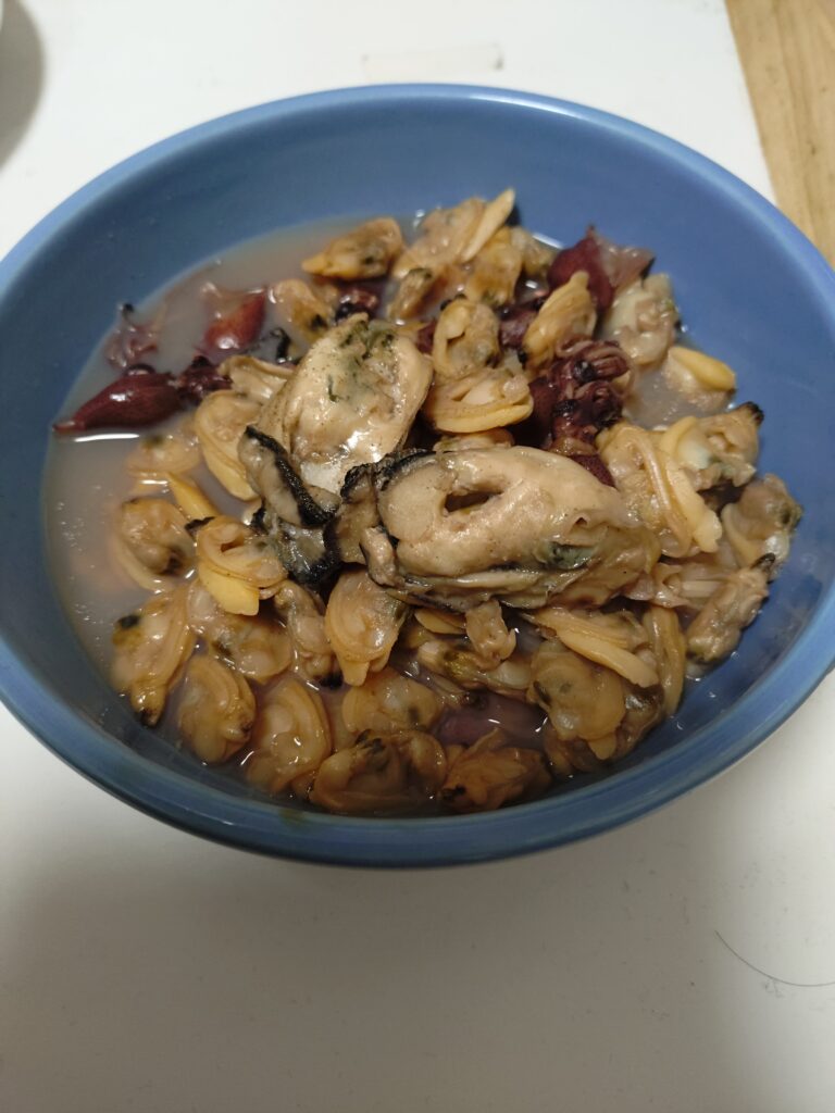 無骨焼きを焼き過ぎた原因がこいつだ。あさり、ホタルイカ、牡蠣の酒蒸し。
