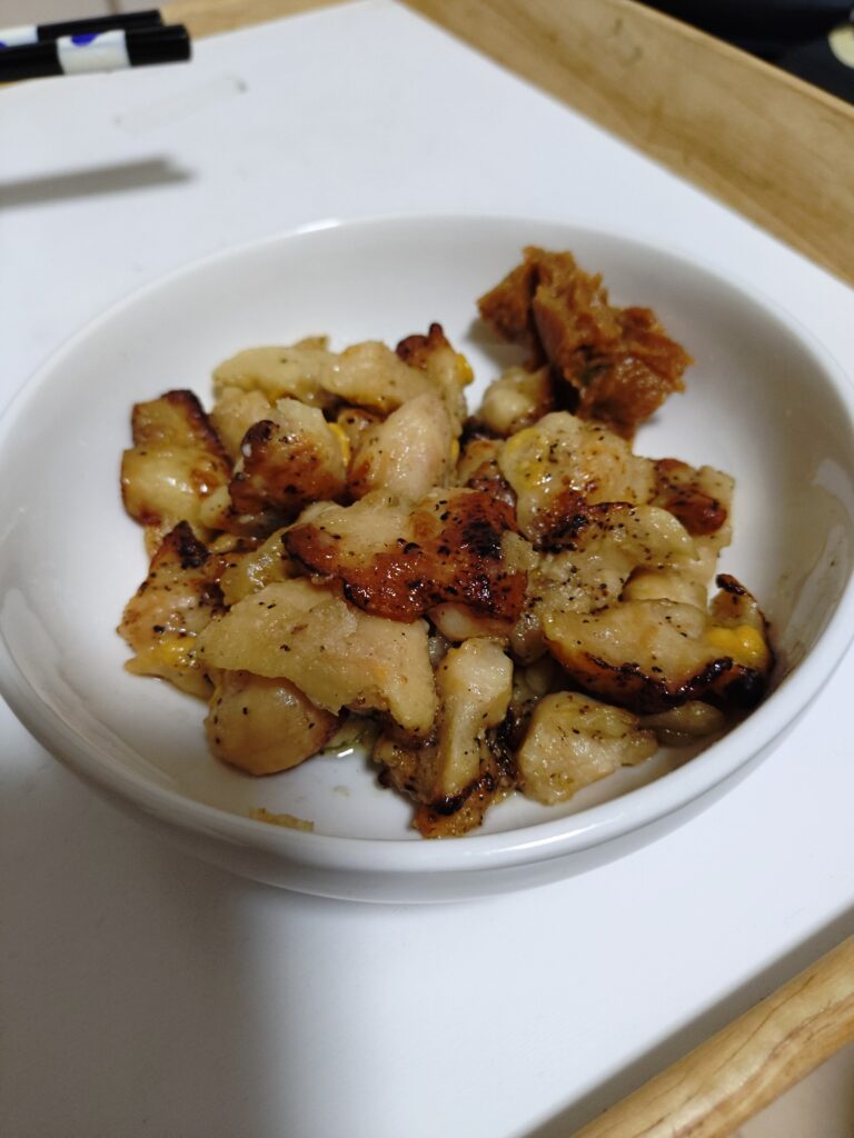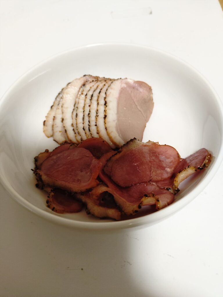ざっくり言えば紅茶鴨の燻製だ。が、それを半分焼いてみた。塩胡椒で味付けはしてあるが、食べてみた感想は「ベーコン」そのものだ(笑)