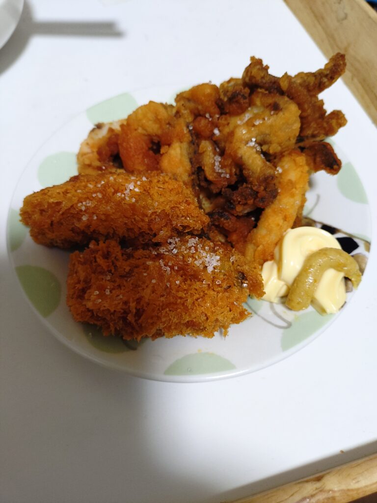 今宵はイカの唐揚げとカキフライの揚げ物コンビから。